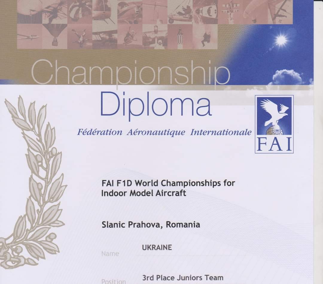 Наприкінці березня 2024 року відбувся Чемпіонат світу з авіамодельного спорту для юніорів (клас моделей для закритих приміщень F-1-D) в місті Сланік Прахова (Румунія).