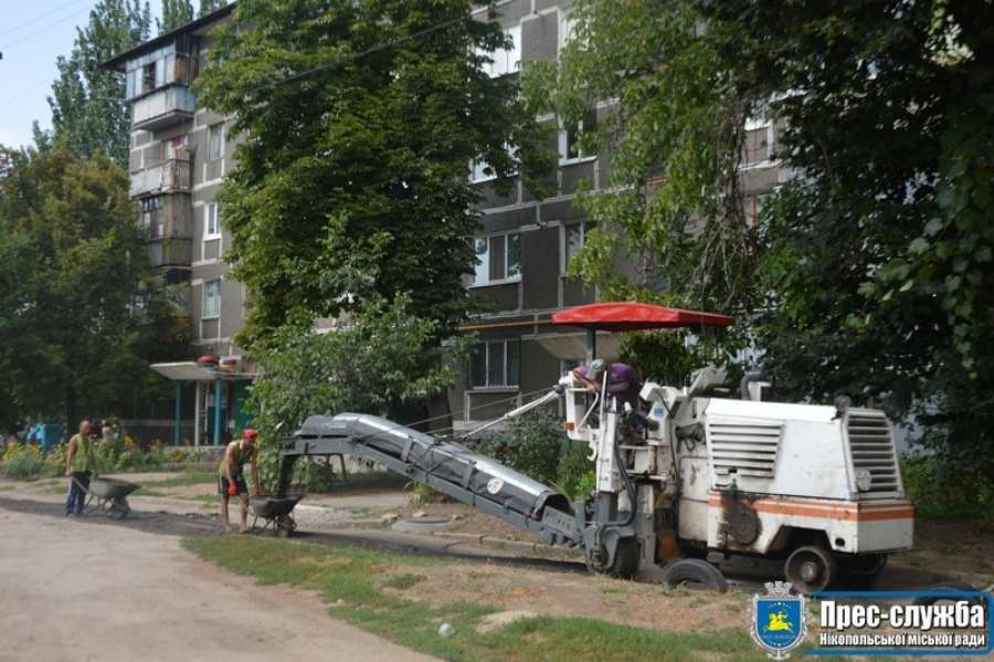 Біля будинку № 21 на вулиці Першотравневій та біля будинку № 56 Б на вулиці Електрометалургів проходить капітальний ремонт внутрішньоквартальних територій, а біля будинку № 54 на вулиці Добролюбова вже укладають новий асфальт.