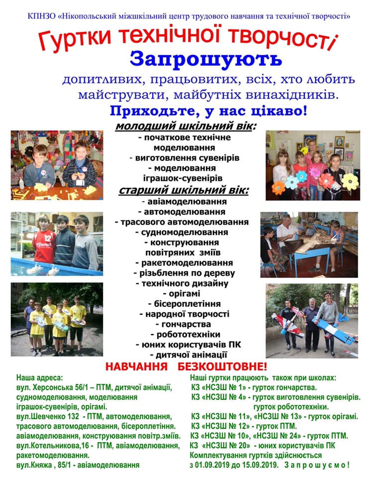 КПНЗО «Нікопольський міжшкільний центр трудового навчання та технічної творчості» запрошує всіх допитливих, працьовитих, всіх, хто любить майструвати, майбутніх винахідників до гуртків технічної творчості!