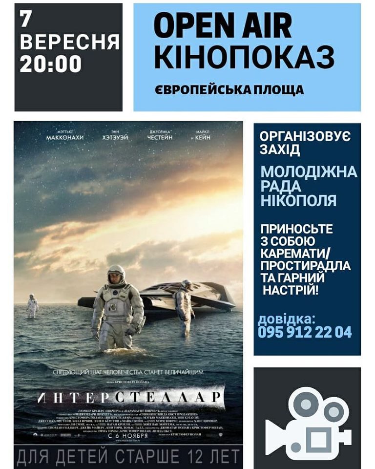 Молодіжна рада Нікополя запрошує на OPEN AIR перегляд художнього фільму “Інтерстеллар”.