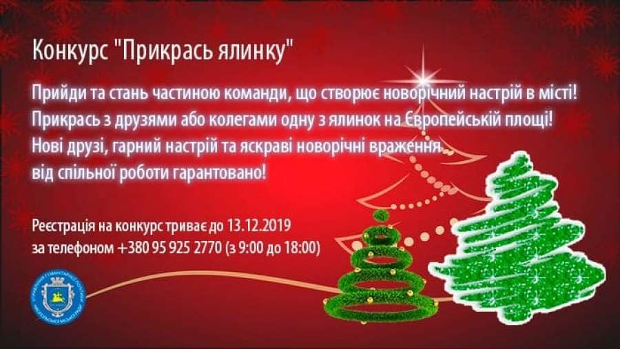 Запрошуються до участі всі бажаючі жителі міста, колективи підприємств, учбових закладів, творчі колективи, громадські організації. Всі ялинки будуть прикрашати Європейську площу протягом новорічних святкувань. Вибір ялинкових прикрас – за командами – учасниками. Команда – переможець отримає заохочувальні призи. Реєстрація на конкурс триває до 13 грудня. Більше інформації та реєстрація за номером телефону +380 95 925 2770 (Ольга Дмитрівна, телефонувати з 9:00 до 18:00).