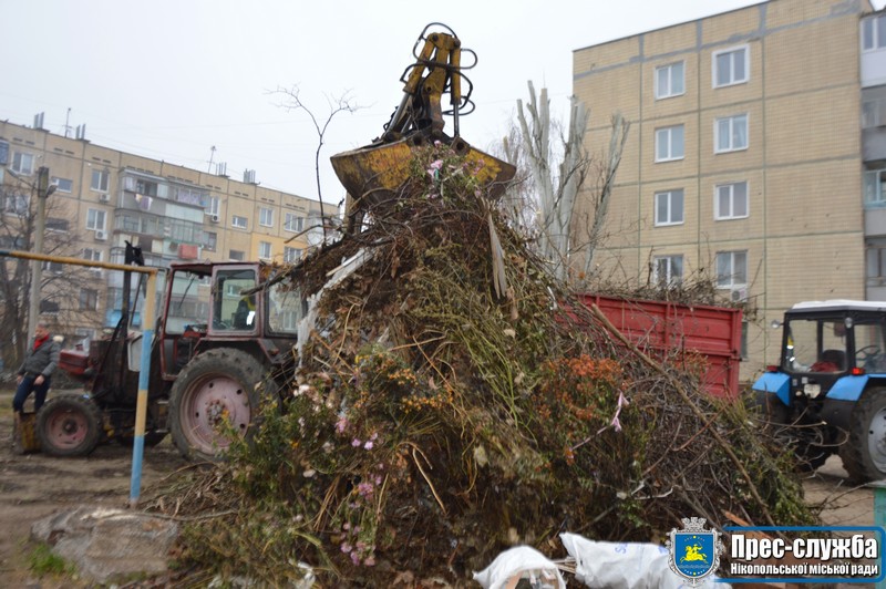 Стихійні звалища та залишки гілок після обрізання дерев грузять за допомогою важкої техніки та вивозять.