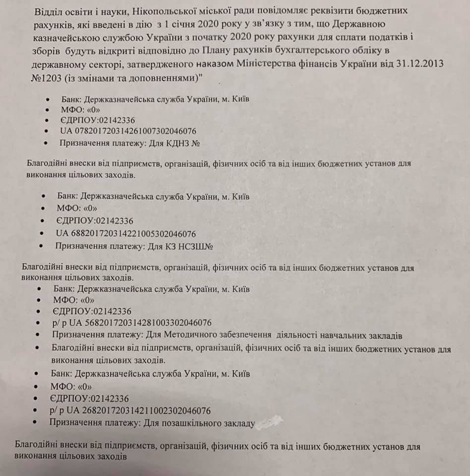 Відділ освіти і науки повідомляє про зміну реквізитів для переведення благодійних внесків від підприємств, організацій, фізичних осіб та від інших бюджетних установ для виконання цільових заходів в зв’язку з введенням в дію нових рахунків за стандартом IBAN.
