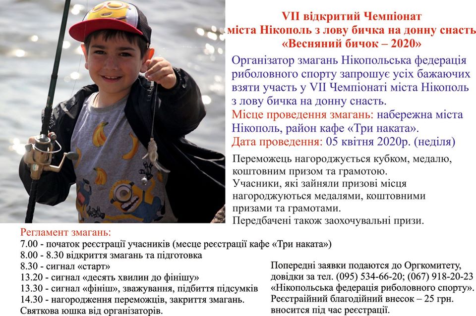 Нікопольська федерація риболовного спорту запрошує до участі у VII Чемпіонаті міста Нікополь з лову бичка на донну снасть усіх хто бажає.
