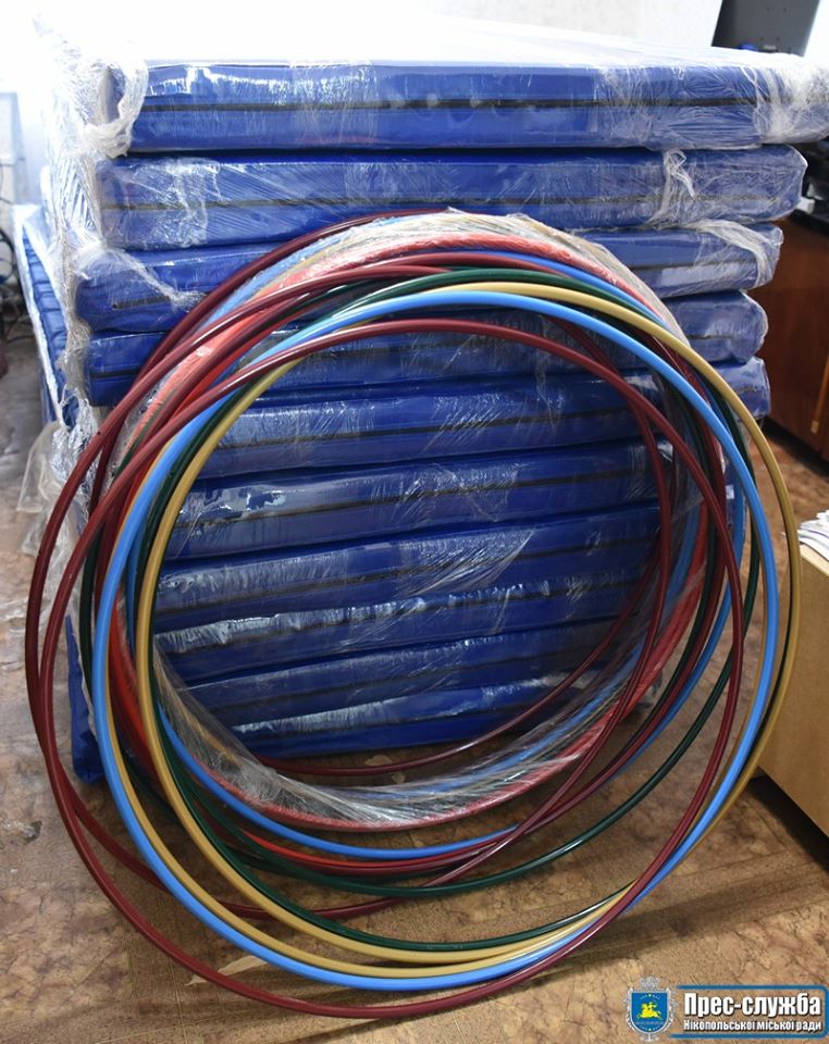 За кошти місцевого бюджету відділом освіти і науки Нікопольської міської ради для закладів загальної середньої освіти закуплено спортивний інвентар для занять з фізичної культури: десять матів розміром 1 на 2 м і товщиною 10 см та металеві обручі. Металеві обручі отримає кожна школа у кількості 2 шт.