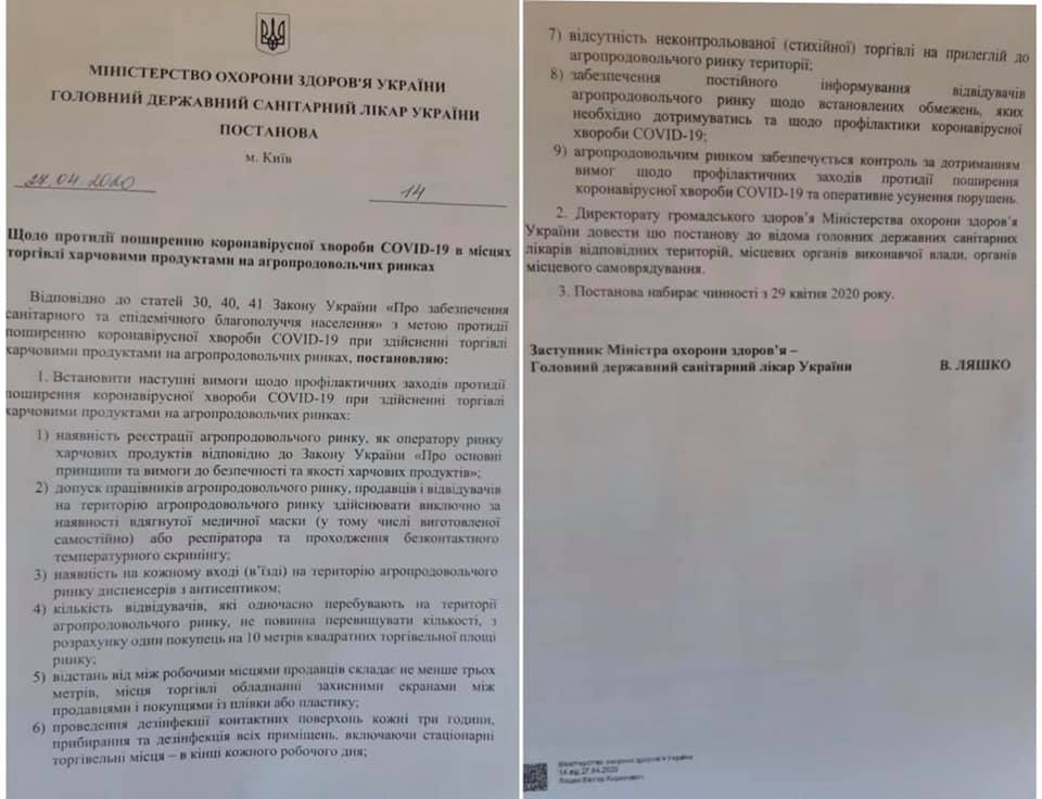 ❗️Згідно постанови МОЗ, Головного державного санітарного лікаря України з 29 квітня дозволено працювати агропромисловим ринкам. Також в Постанові йдеться про певний перелік вимог до робот ринків.