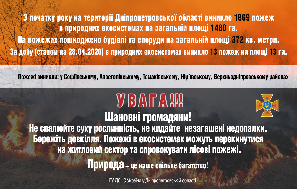Тільки за минулу добу (28.04.2020) на території Дніпропетровської області в природних екосистемах виникло 13 пожеж на загальній площі 13 га. Найпоширеніші пожежі в екосистемах – це трав’яні підпали. У більшості випадків причиною загорянь є людський фактор. Громадяни спалюють сміття і торішню траву на своїх городах і присадибних ділянках, а діти підпалюють траву біля доріг і на пустирях. Все це призводить до серйозної пожежі, і під загрозою може опинитися чиєсь життя та житло.