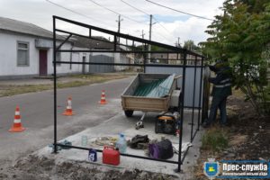 На вулиці Гетьманській біля будинку № 30 встановлюють майданчик для збору твердих побутових відходів. Металеву конструкцію обшивають профнастилом зеленого кольору.