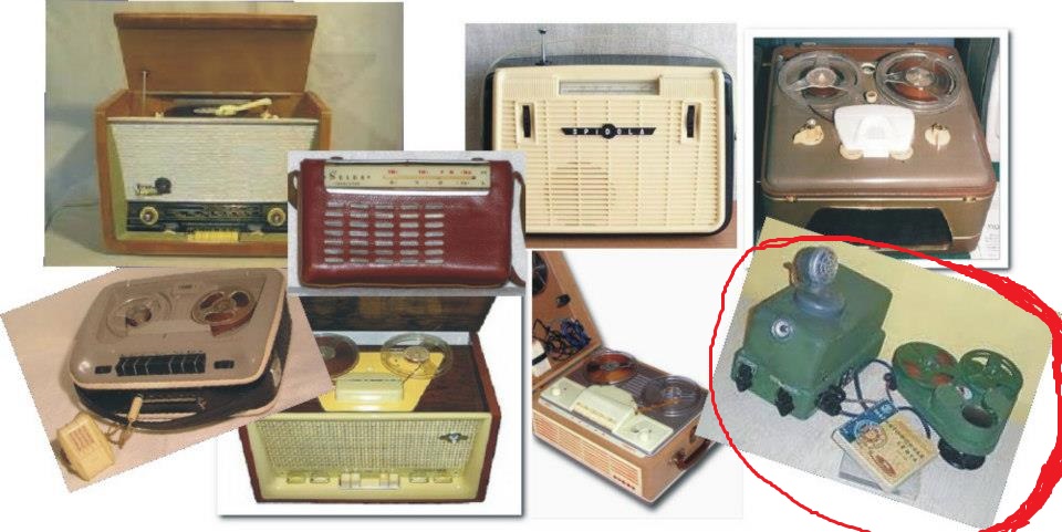 И еще маленький секрет: чтобы голос в эфире звучал «солиднее» динамик, который использовался вместо микрофона (микрофон дорого стоил, а найти старый динамик проблемы не составляло) ставили в большую кастрюлю или в выварку. Магнитофоны были большой редкостью и стоили невероятно больших денег, поэтому у меня была приставка: поставил пятку в радиолу вместо пластинки – и имеешь воспроизведение или запись кассеты 80 метров. Смотрите нижнее правое фото (мы его указали и обвели красным цветом).