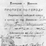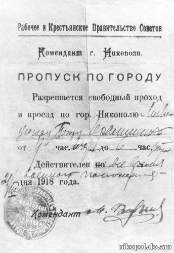 Советская власть ввела тогда в Никополе военное положение. Пропуск был выдан 21 марта 1918 года и разрешал милиционеру Петру Герасименко свободный проход и проезд по городу Никополю с 21:00 до 6:00, на время комендантского часа. До прихода австрийцев в Никополь оставалось 2 недели.