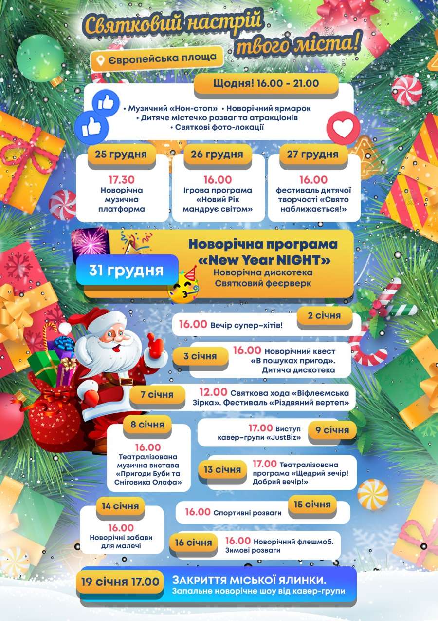 Європейська площа! Щодня! Щодня! Щодня! 16. 00: Музичний «Нон-стоп» Новорічний ярмарок Дитяче містечко розваг та атракціонів Святкові фото-локації 25. 2021р.