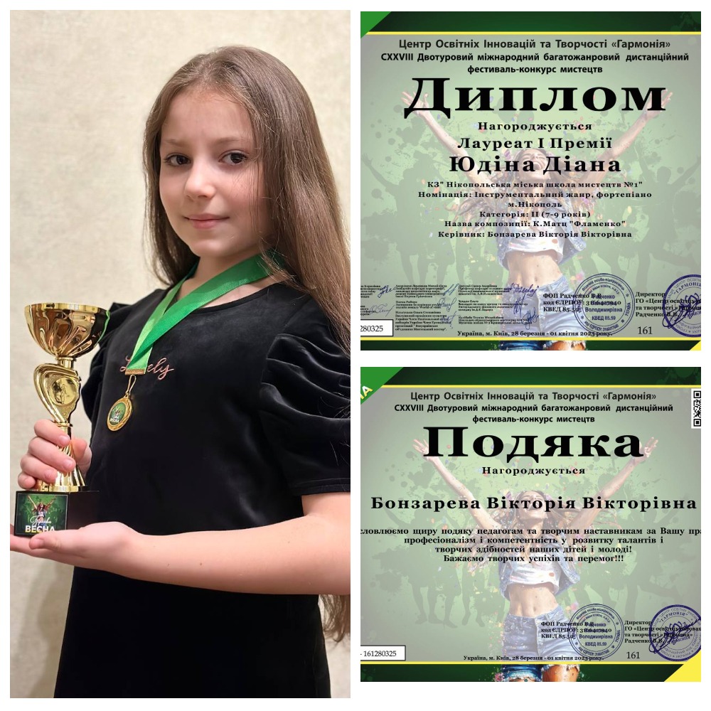 2) Учениця фортепіанного відділу Нікопольської міської школи мистецтв Діана Юдіна здобула перемогу у двотуровому міжнародному конкурсі мистецтв “Зіркова весна”, м. Київ. У своєму дебютному виступі Діана стала лауреатом I ступеня. Викладач Вікторія Бонзарева.