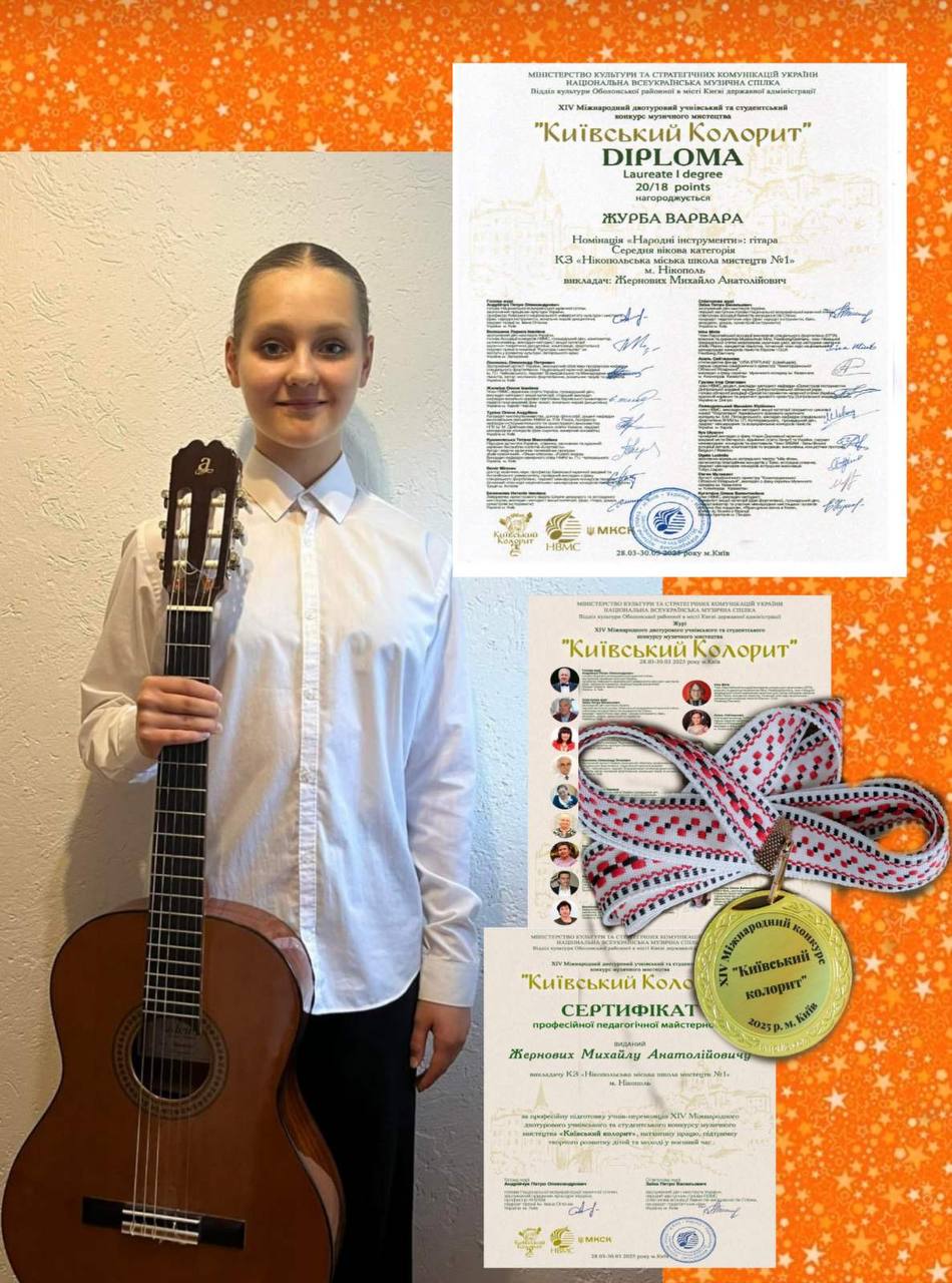 3) Учениця відділу народних інструментів Нікопольської міської школи мистецтв Варвара Журба здобула блискучу перемогу на Міжнародному двотуровому учнівському та студентському конкурсі музичного мистецтва “Київський колорит”, м. Київ. Варвара стала лауреатом 1 ступеню, викладач Михайло Жернових. Конкурс проходив під патронатом Міністерства культури та інформаційної політики України і Національної всеукраїнської музичної спілки. Завдяки участі в такому авторитетному конкурсі Варвара здобула прекрасний досвід, який надихатиме на подальші музичні перемоги!