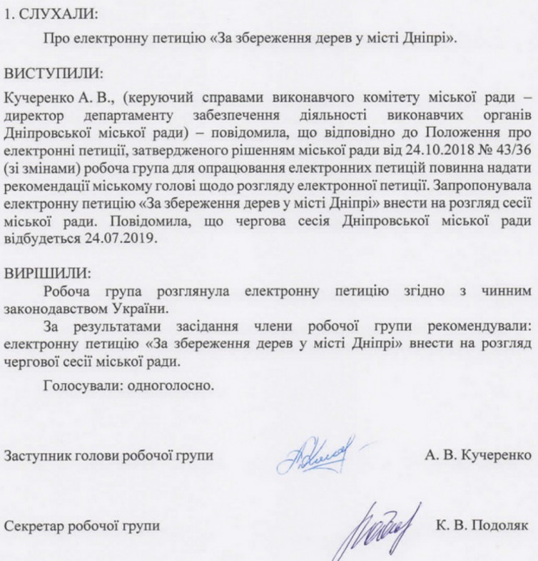Робоча група міськради одноголосно вирішила винести на розгляд сесії міськради електронну петицію “За збереження дерев в місті Дніпрі”.