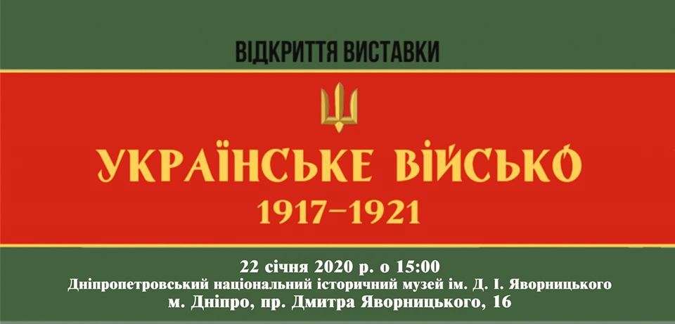 У Дніпропетровському національному історичному музеї ім. Д. Яворницького покажуть нову виставку. Мовою експонатів «розкажуть» історію українського війська періоду революції 1917-1921 років. Відкриття приурочили до Дня Соборності України. Про це повідомили в управлінні культури, національностей та релігій Дніпропетровської облдержадміністрації.