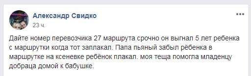 -Дайте номер перевозчика 27 маршрута, срочно, он выгнал 5-летнего ребенка с маршрутки, когда тот заплакал, – поясняется в сообщении. – Папа пьяный забыл ребенка в маршрутке на Ксеневке, ребёнок плакал. Моя теща помогла младенцу добраться домой к бабушке.Он был в 17 30 возле церкви на Ксеневке за виадуком.С этой информацией в группе ознакомился заведующий сектором контроля и мониторинга договорных обязательств департамента транспорта и транспортной инфраструктуры днепровского горсовета Иван Васючков.
