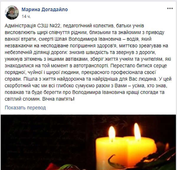 3 февраля в Каменском произошло ЧП. Водитель автобуса умер прямо за рулем маршрутки полной школьниками во время движения на оживленной магистрали. От многочисленных жертв спасло чудо. Родители школьников, попавших в ДТП утверждают, что даже несмотря на своё состояние водитель пытался избежать аварии и спасти детей. Об этом в группе Типичный Днепродзержинск сообщает Марина Догадайло «Адміністрація СЗШ №22, педагогічний колектив, батьки учнів висловлюють щирі співчуття рідним, близьким та знайомим з приводу важкої втрати, смерті Шпая Володимира Івановича – водія, який незважаючи на несподіване погіршення здоров’я, миттєво зреагував на небезпечній ділянці дороги: знизив швидкість та звернув з дороги, уникнув зіткнень з іншими автівками, зберіг життя учням та учителям, які знаходилися на той момент в автотранспорті. Перестало битися серце порядної, чуйної і щирої людини, прекрасного професіонала своєї справи. Пішла з життя найдорожча та найрідніша для Вас людина. У цей скорботний час ми всі глибоко сумуємо разом з Вами – усіма, хто знав, поважав та буде берегти про Володимира Івановича кращі спогади та світлий спомин. Вічна пам’ять!», – отмечается в сообщении.Ранее мы писали о том, что в Каменском водитель автобуса умер прямо за рулем маршрутки.