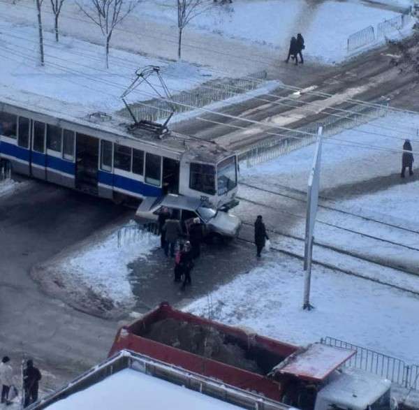 Не проскочил: на Левобережном-3 легковушка «вляпалась» в трамвай (ФОТО)