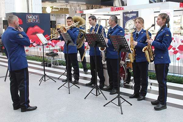В торгово-развлекательном центре «Мост-сити» бойцы Нацгвардии раздавали валентинки, а праздничное настроение горожанам поднимал военный оркестр.
