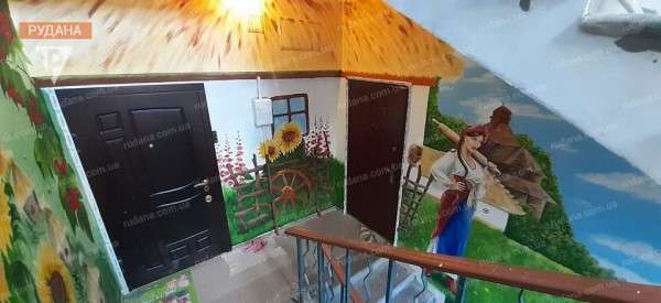 Але дівчина не змогла продовжити роботу, тож жителі під’їзду запросили художника Андрія Калінкіна. Він оформив стіни в етнічному стилі, зобразивши українську хату під солом’яним дахом, маки, козаків, поля з соняшниками та пшеницею.Андрій розмалював під’їзд до третього поверху і розповів, що на роботу витратив 2,5 тижня, при цьому малював не балончиками для графіті, як завжди, а звичайними пензлями.