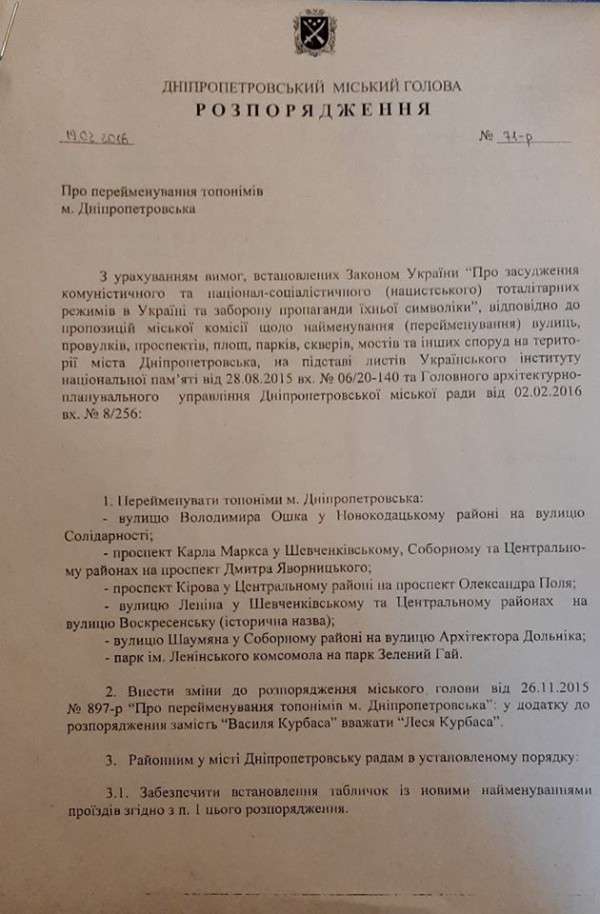 – Чотири роки тому, 19 лютого 2016 року, було підписане розпорядження, згідно якого головний проспект нашого міста, що з 1923 року носив ім’я Карла Маркса було перейменовано на честь видатного вченого історика, археолога, етнографа, фольклориста, академіка ВУАН, фундатора Дніпропетровського національного історичного музею академіка Дмитра Яворницького.Це неймовірно логічне рішення, адже саме на цьому проспекті знаходиться найбільше будівель безпосередньо та беззаперечно пов’язано з постаттю Д.Яворницького. Серед них і історичний музей, і гірничий університет, і будівля коледжу культури (колишня будівля міської думи), другий (раніше перший) корпус ДНУ, готель “Україна”, Головпоштамт…А ще не так давно у нас в музеї з’явилася завірена головою комісії з перейменування копія розпорядження, яку (частково) пропонуємо Вашій увазі (см. ФОТО), – говорится на страничке “Садиби Дмитра Яворницького”.