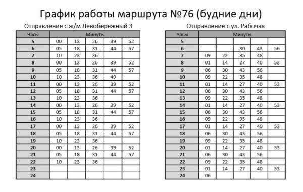 – Первым будет автобусный маршрут №76, график движения на картинке. В тупиках и в салонах автобуса (для большей информативности) уже сегодня будут развешаны эти графики. Обратите внимание, что это график работы для будних дней, для выходных и праздничных появятся к концу недели.