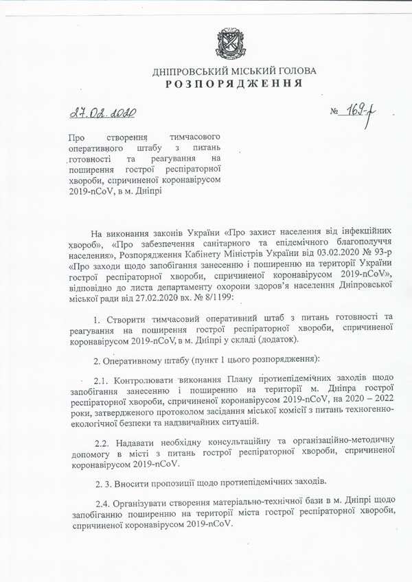 Хоча немає приводів для хвилювань, у Дніпрі вже створено штаб з питань готовності та реагування на поширення гострої респіраторної хвороби, спричиненої коронавірусом. Відповідне розпорядження підписав міський голова Дніпра Борис Філатов.
