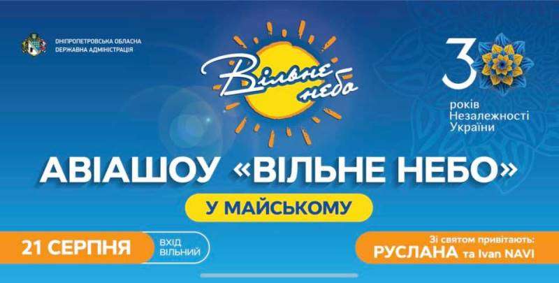 На Днепропетровщине идут последние приготовления к грандиозному авиашоу «Вільне небо». Зрелищным фестивалем область будет отмечать 30-летие Независимости Украины. В небе в Майском будут кружить пилоты-асы, на сцене будут зажигать звезды украинской эстрады — Руслана и Ivan NAVI.