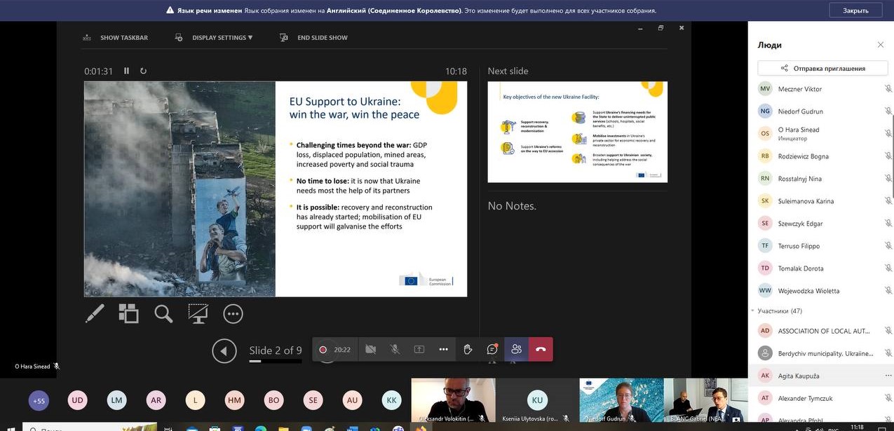 Програма заходу була дуже актуальною та насиченою. Ознайомилися з презентаціями проєкту висновки Європейського Комітету Регіонів щодо Українського фонду від пані Наталі Пауеллс, керівника міжінституційного відділу Допомога та реконструкція, DG NEAR, Європейська Комісія, та пана Даріо Нарделла (ІТ/ПЕС).
