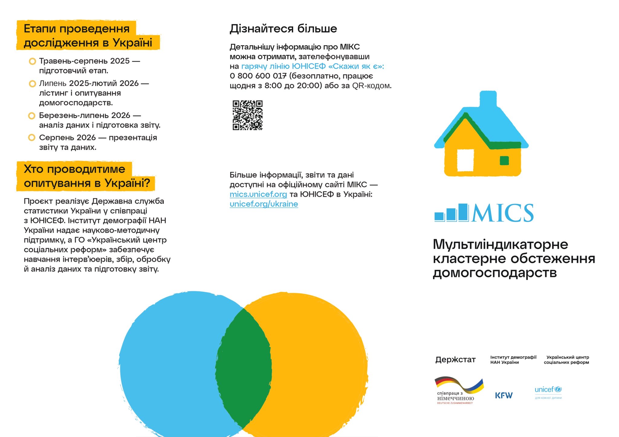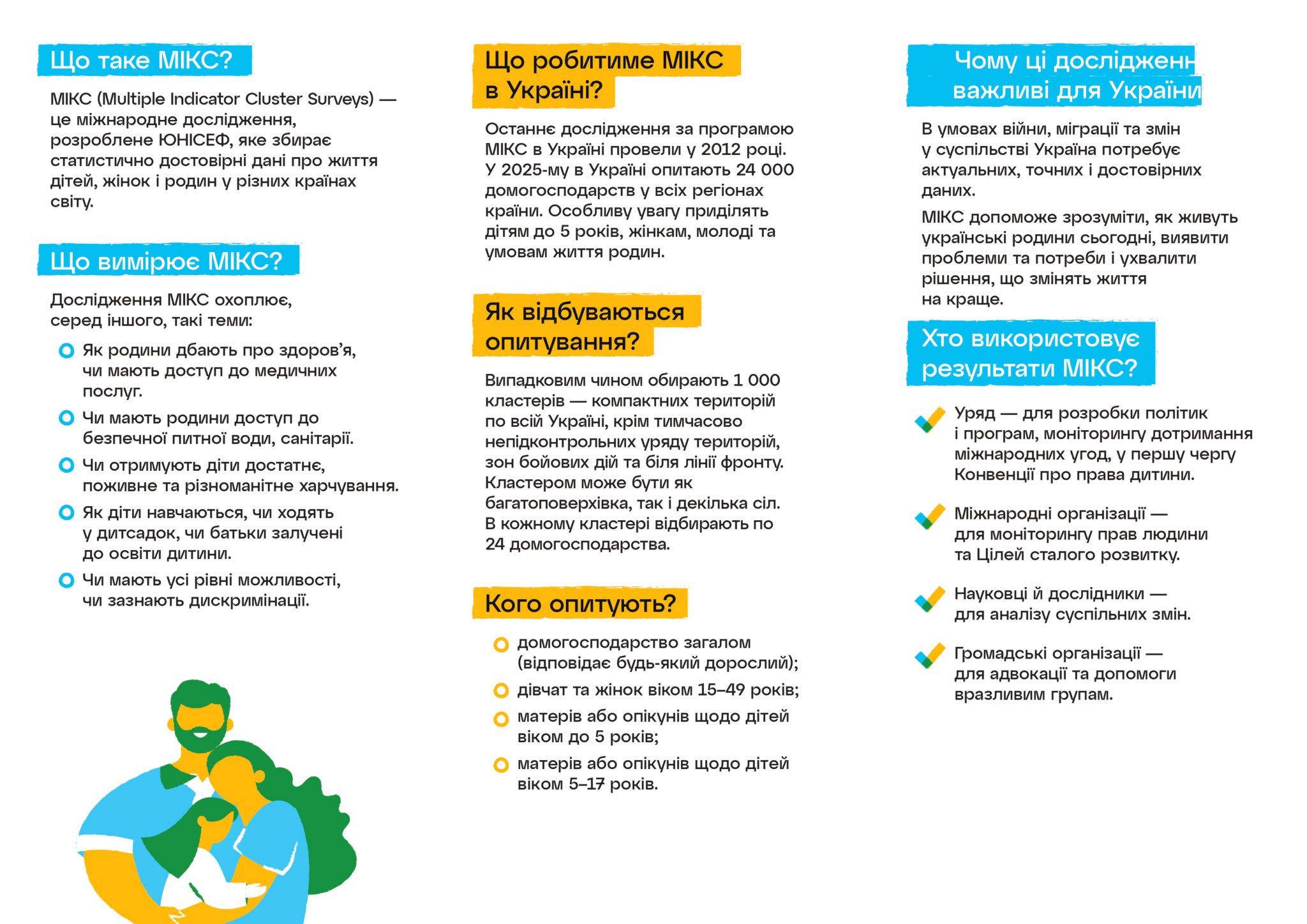МІКС – це вибіркове обстеження домогосподарств за міжнародною методологією. Опитування дозволяє отримати дані для моніторингу становища дітей і жінок у сферах охорони здоров’я, освіти, безпеки, харчування, водопостачання.