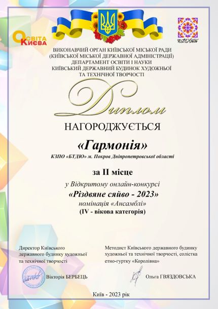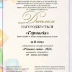 ІІ місце у відкритому онлайн-конкурсі “Різдвяне сяйво 2023”посів вокальний ансамбль “Гармонія”. Творчі підопічні Анжеліки Сичевської презентували себе у номінації “Ансамблі”.