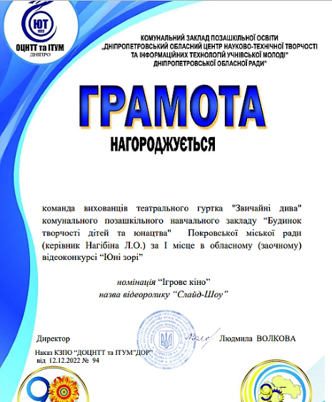 Команда театрального колективу “Звичайні дива” посіла І місце в обласному відеоконкурсі юних відеоаматорів “Юні зорі”. Вихованці Людмили Нагібіної заявили про себе у номінації “Ігрове кіно” з відеороликом “Слайд – Шоу”.