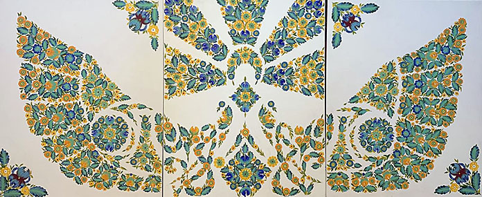 Її роботи – не просто барвисті візерунки, а повноцінні смислові композиції. Погляньте лише на триптих “Птах -оберіг України”.