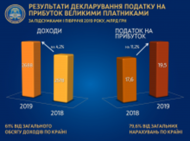 Так, крупными плательщиками Офиса задекларировано 19,5 млрд грн налога на прибыль, что на 1,9 млрд грн или на 11,2% больше фактических начислений за аналогичный период прошлого года (за 2 квартал 2018 год задекларировано 17,5 млрд грн).