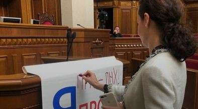 В итоге народный депутат Юлия Клименко подошла к баннеру и написала «ПТН-ПНХ».