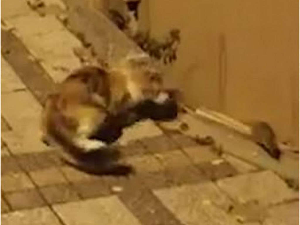 На улице турецкого города Стамбул прохожий заснял на видео интересную сцену. Кот видит бегущую крупную мышь и бросается за ней.