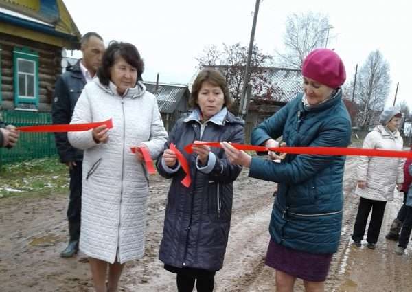На фотографиях видно, как глава поселения Наталья Редькина, первый заместитель главы района Альфира Балтачева и куратор по району реализации программы «Инициативное бюджетирование» Розалия Бекмансурова перерезают красную ленточку. Гости открытия стоят в грязи в резиновых сапогах.
