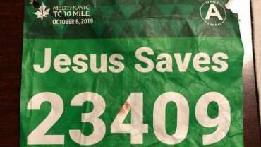 Американец Тайлер Мун решил поучаствовать в своем первом забеге на 16 километров в рамках марафона Twin Cities Marathon в Миннеаполисе и надел номер с надписью «Jesus Saves» («Иисус спасает»).