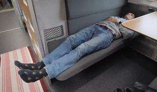 На фотографии мужчина лежит на спальном месте в новом плацкартном вагоне. Примечательно, что оно оказалось слишком коротким и треть длинны ног мужчины вылезает за пределы данного места попросту закрывая проход в вагоне.
