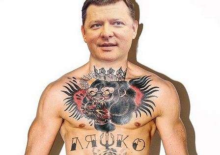 На груди нового тела Олега Валерьевича набит образ мифического существа в короне, под ним большими буквами написано Ляшко, а еще ниже морда тигра. Лидер Радикальной партии подписал этот снимок единственной фразой «Народное творчество».
