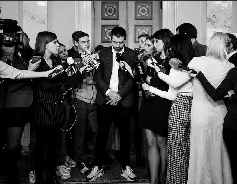На фото Арахамия в интересной позе – с опущенными глазами и сложенными руками, по всей видимости, молчит. В то же время представители прессы, которые окружили нардепа, требуют от него комментариев.