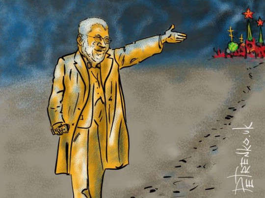 После того, как американское издание The New York Times опубликовало интервью с украинским олигархом Игорем Коломойским, который заявил, что Украине нужно дружить с Россией, на это заявление отреагировал карикатурой художник Андрей Петренко.