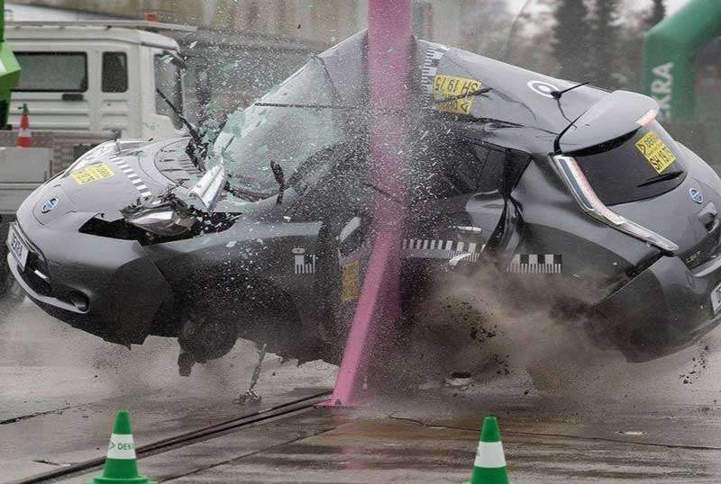 Немецкая ассоциация DEKRA, осуществляющая технический надзор в сфере автотранспорта, провела краш-тест Nissan Leaf: машину разбили об столб на скорости 75 и 84 км/ч. Скорость была выбрана заведомо выше, чем при испытаниях Euro NCAP, где электромобиль набрал максимальные пять звезд.