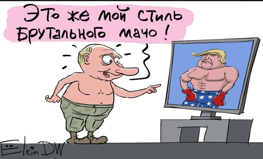 Так, на рисунке изображен голый до пояса глава Кремля, который смотрит на фото человека с лицом Трампа и телом юного Сильвестра Сталлоне и говорит, что это его «стиль брутального мачо».