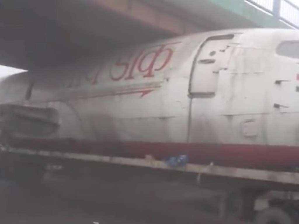 На кадрах видно, что водителю удалось протащить нос самолета под мостом и судно застряло как раз центральной частью.