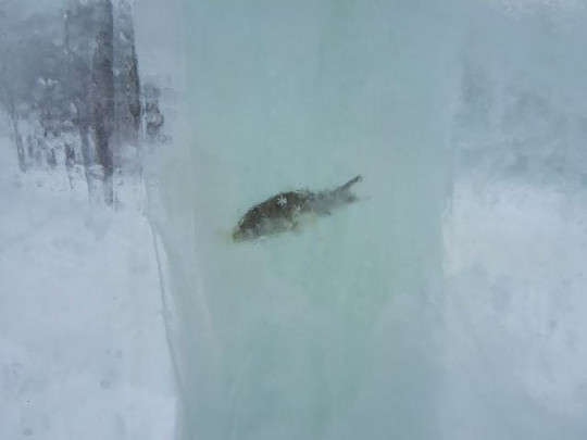 Сообщается, что лед, который используется для строительства городка, образуется в естественных условиях, и когда его нарезали, то не былое видно, что находится внутри. А вмерзшие рыбы стали видны лишь после того, как ледяные глыбы, из которых строили городок, отшлифовали.