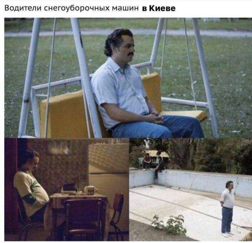 Забавная фотожаба состоит из трех иллюстраций, на которых легко одетый мужчина бездельничает, сидя на качели, дома за столом, или просто отбрасывает тень во дворе. «Водители снегоуборочных машин в Киеве», — подписана картинка.