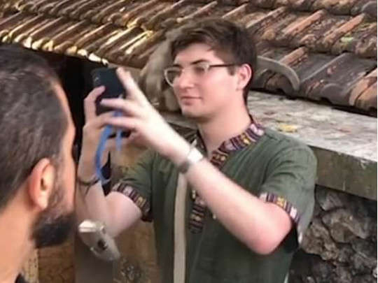 24-летний турист Коннор Сарджент, посетивший храм Улувату в индонезийской провинции Бали, решил сделать селфи с одной из обезьян, которые во множестве обитают в этой местности. Повернувшись к животному спиной, Коннор готовился сделать снимок, когда обезьяна вдруг сорвала с его носа очки и забралась с ними повыше на крышу. Там она начала рассматривать свой трофей и даже пробовать его на зуб. На этом видео обрывается.