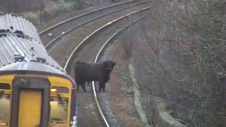 Шотландская горная корова породы хайленд перекрыла железнодорожные пути в час-пик около Глазго, передает Sky News.