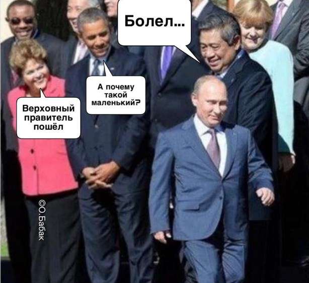 Автор взял старое фото с международного саммита с участием Путина, где особо заметен его низкий рост и прописал диалог между участниками по поводу лидера России. В частности, персонаж 44 президента США Барак Обама интересуется почему верховный правитель «такой маленький», в ответ ему говорят, что тот якобы «болел».